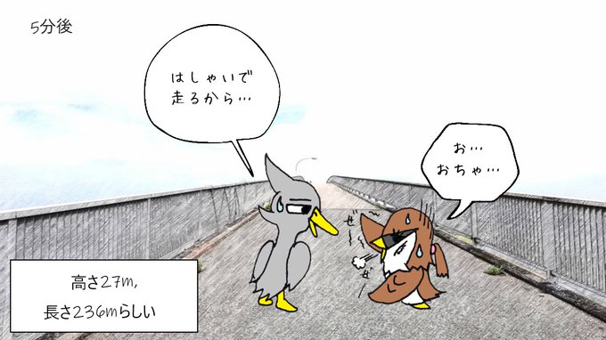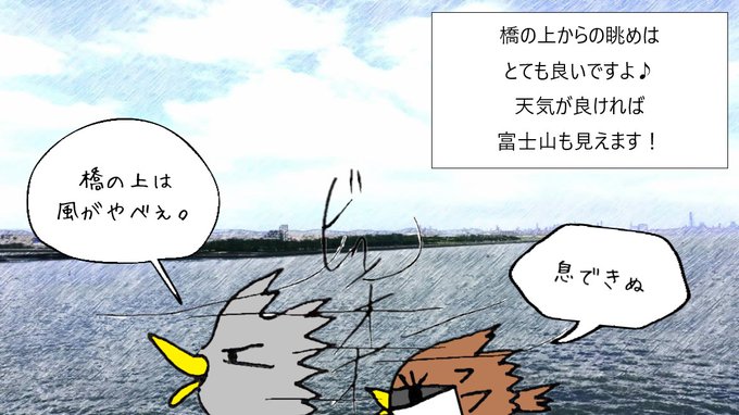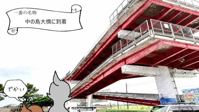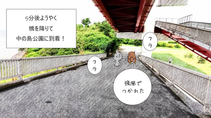 旅鳥くろまる @kuromaru_puniko おはようございます♪ 中の島大橋を渡るくろまるとぷに子! 大きな橋を渡っていきますよ! 中の島にはたどり着けるのでしょうか… #漫画が読めるハッシュタグ #漫画 #まんが #マンガ #イラスト #くろまる #千葉県 https://t.co/RzeiMK8SSL
