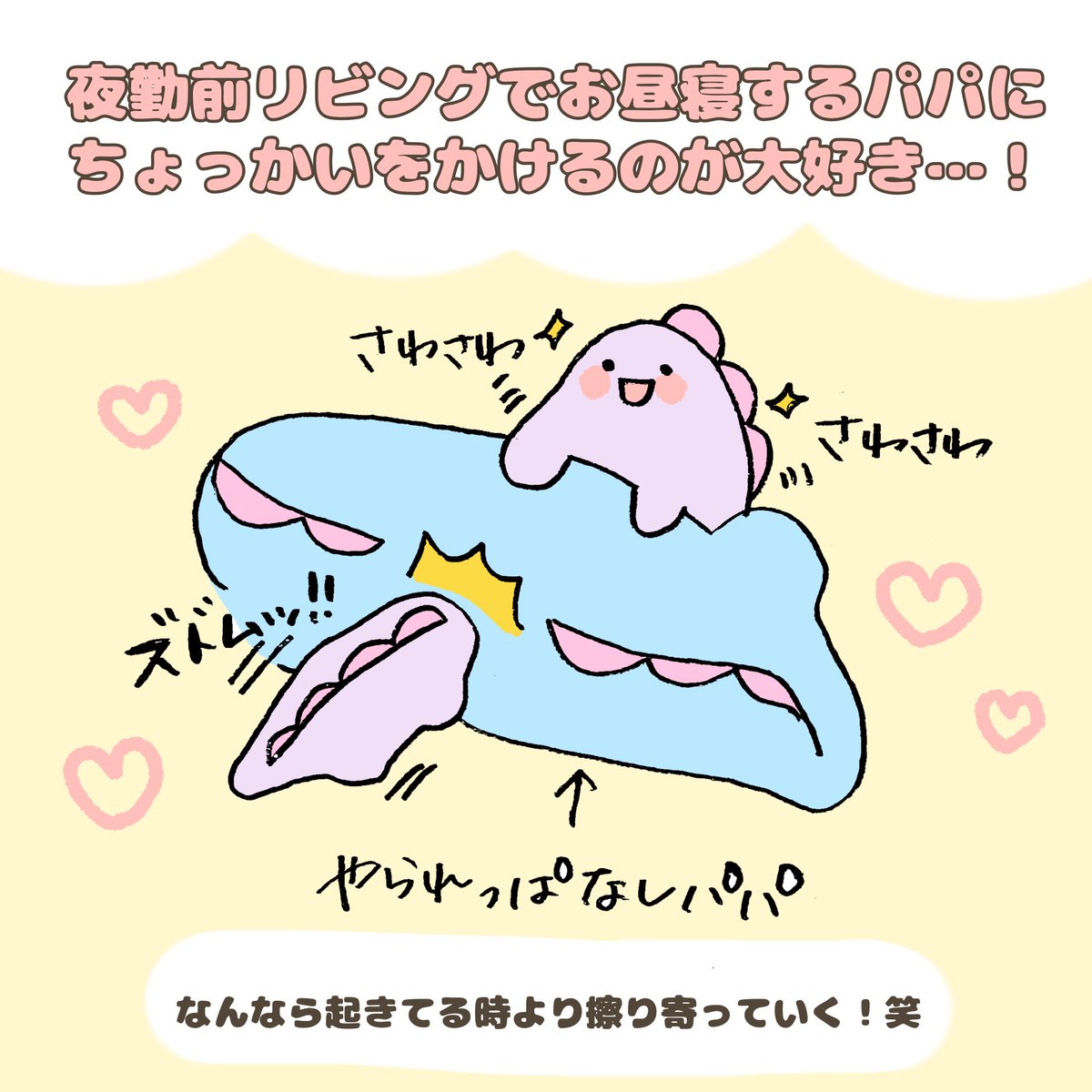 ぱに@10m🦕🎀 @panimama0325 寝かしてあげて~😂って思うけど、パパももぉーとか言いつつ嫌そうではないから良しとしてる🙆♀️ パパ大好きなすっぴ❤️ #もちもちサウルス #育児 #育児漫画 #絵日記 #漫画が読めるハッシュタグ #赤ちゃん #ベビー #1歳 #子ども https://t.co/LlFWA3SPTA