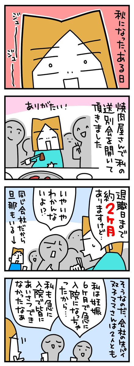 pico @picoart6 👶双子妊娠で人生変わった話👶 16/40 2ヶ月前と超早めの送別会🍺 続く #妊娠 #双子 #男女双子 #twins #同居 #退職 #パニック障害 #育児漫画 #4コマ #4コマ漫画 #漫画 #イラスト #イラストレーター #エッセイ #イラスト好きな人と繋がりたい #絵描きさんと繫がりたい #漫画が読めるハッシュタグ https://t.co/VWC8rvtWSY