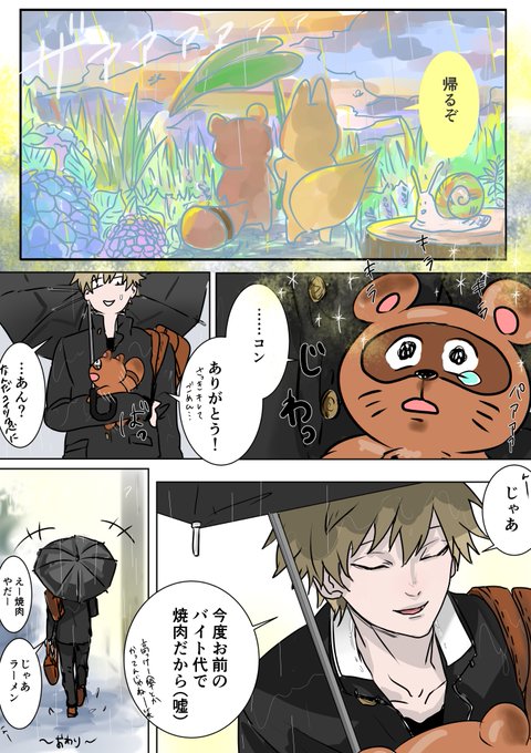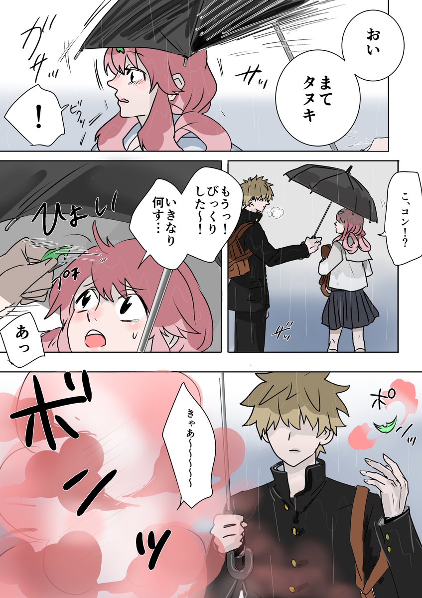 ひゃくねんびびっと@創作漫画 @100akinana タヌキとキツネが化けて高校生になる話です。 「ホンダトコンノ」 #創作漫画 #漫画が読めるハッシュタグ #漫画 『梅雨』 前編①②③ https://t.co/s3bsNhjxlx