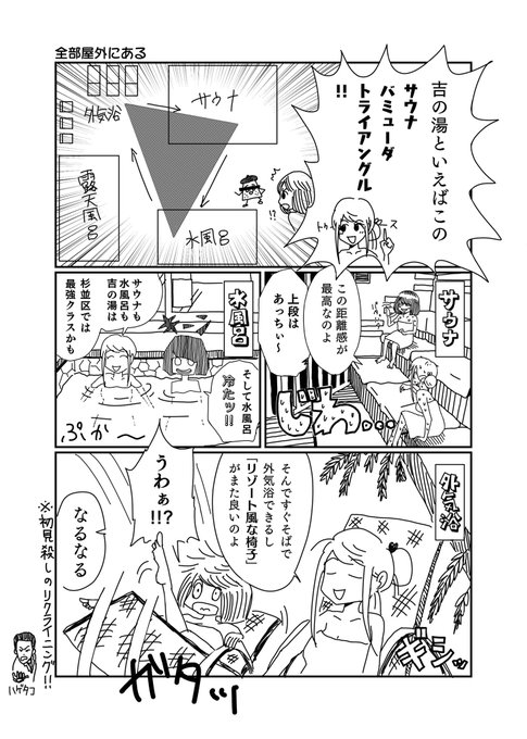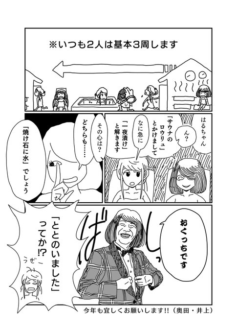 奥田と井上のサウナ日記 @nobosetawa 杉並区の吉の湯(@yoshinoyu1010)に行った話を描きました! 一番好きなサウナかもしれません…! 今年も奥田と井上をよろしくお願いします♨️ (おくだ) #サウナ #サウナを愛でたい #サ活 #サウナイキタイ #サ道 #漫画が読めるハッシュタグ https://t.co/XfkmNjgZHi